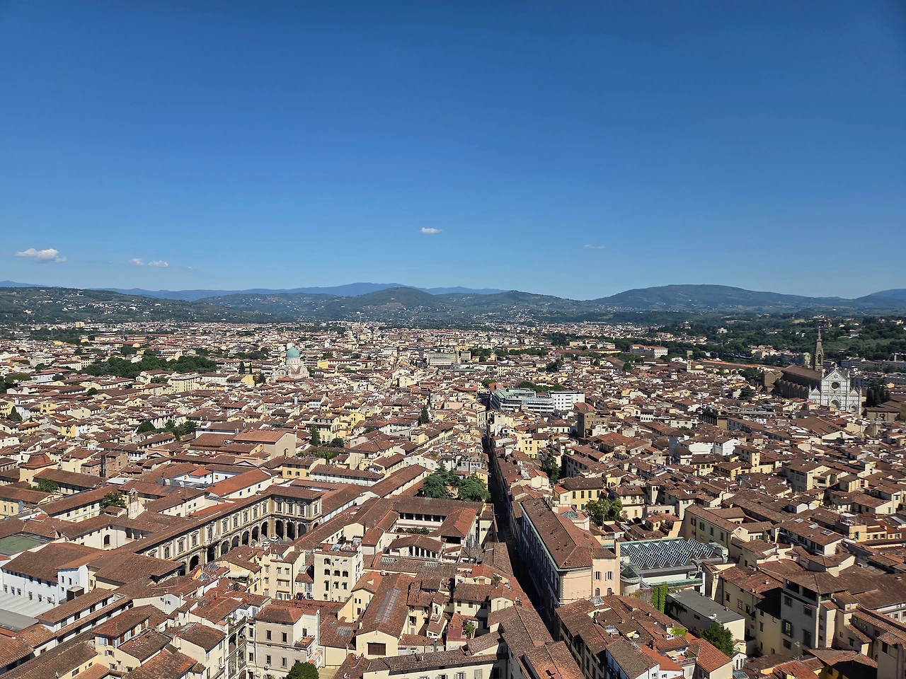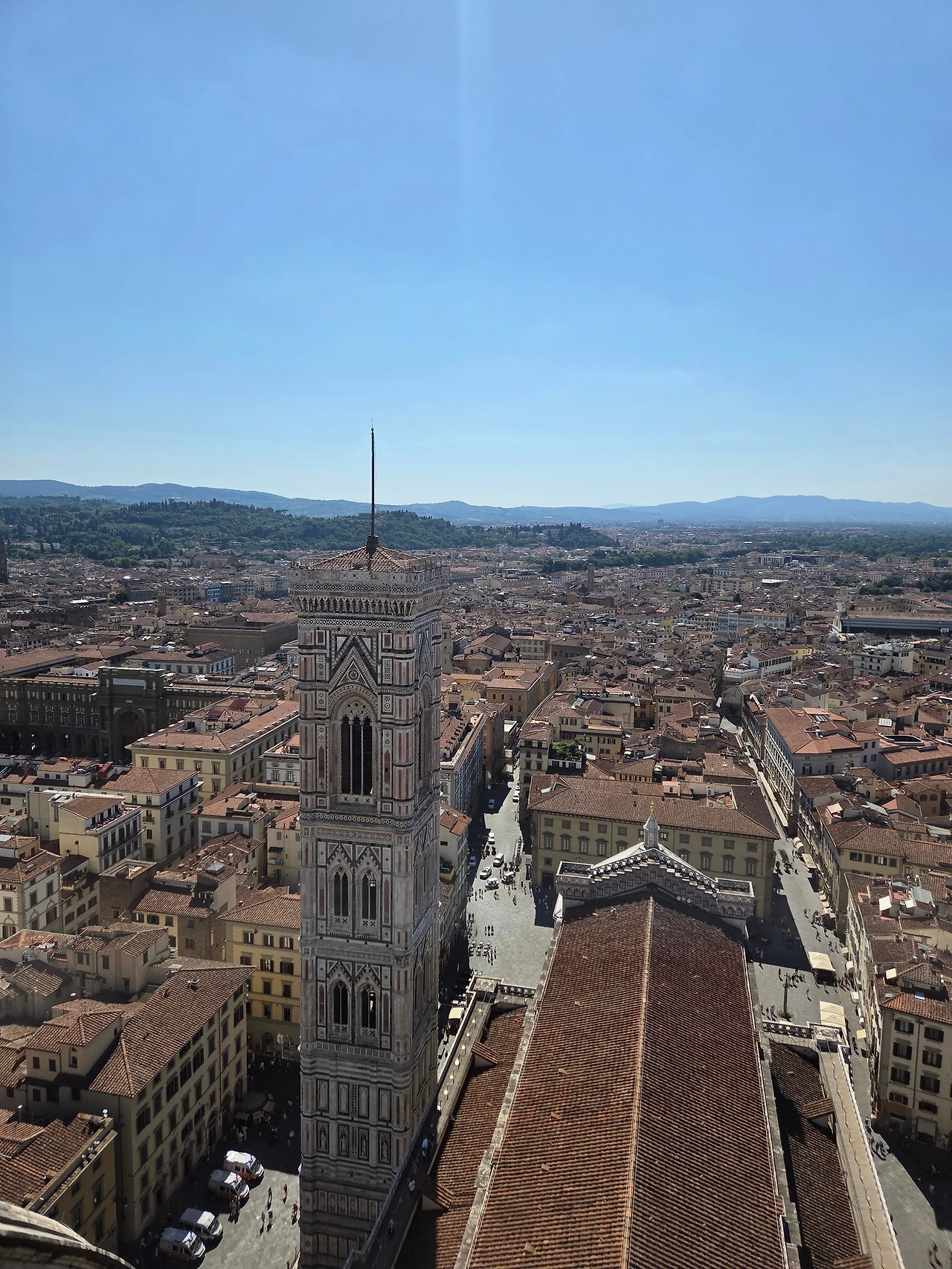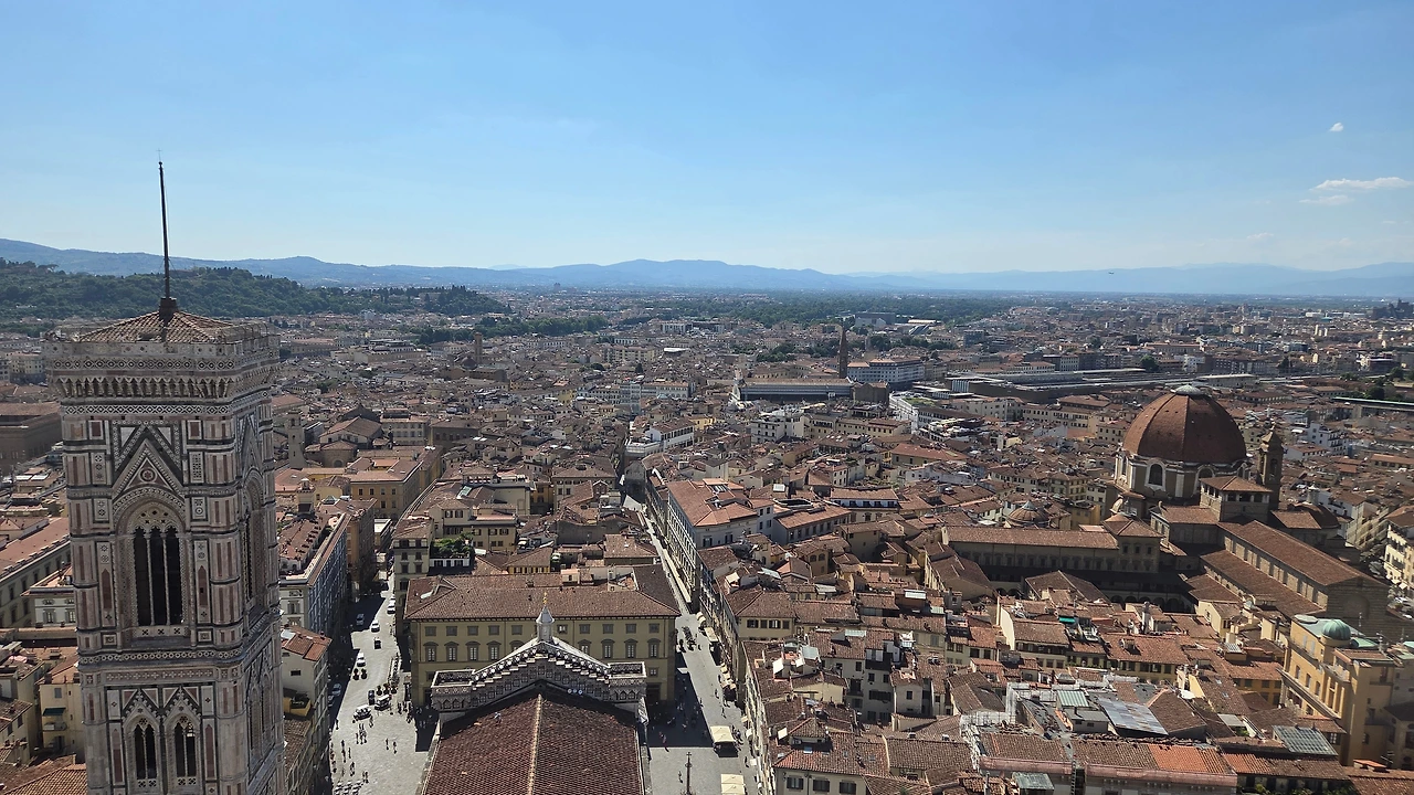 위에서는 피렌체의 전경이 360도로 보였다. 지붕이 모두 적갈색으로 통일되어 있어서 그런지 왠지 모를 안정감이 느껴졌다. 조토의 종탑을 바로 앞에서 볼 수 있었고, 옆의 동그란 지붕인 메디치 예배당이 내려다보였다.