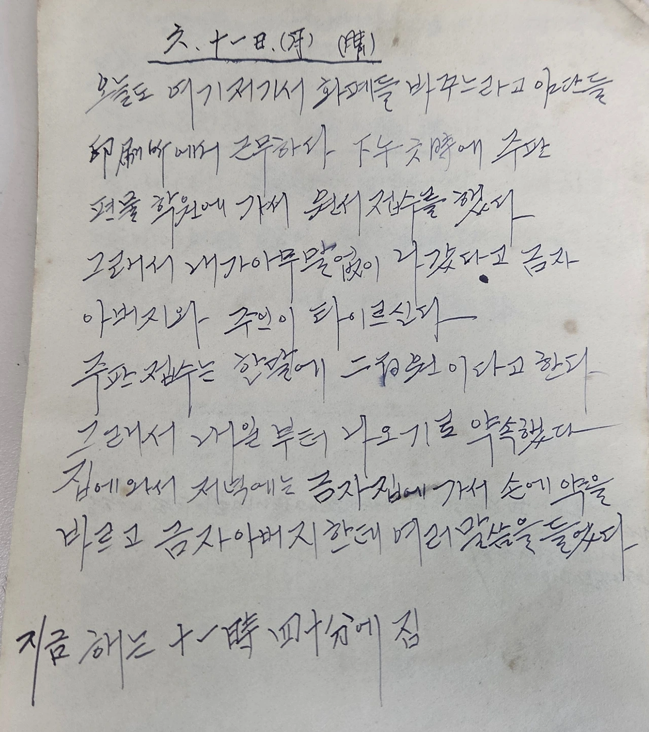 회사에서 돌아오면서 아카징크 100 환, 옥키시루 100 환, 호다이 50 환 (250 환 미납) 사가지고 와서 내가 손을 치료했다. 밤에는 금자 어머니가 라디오에서 그런다고 돈이 바꾸어진다고 하시면서 돈추리들 하지 말라고 당부하고 가셨다.