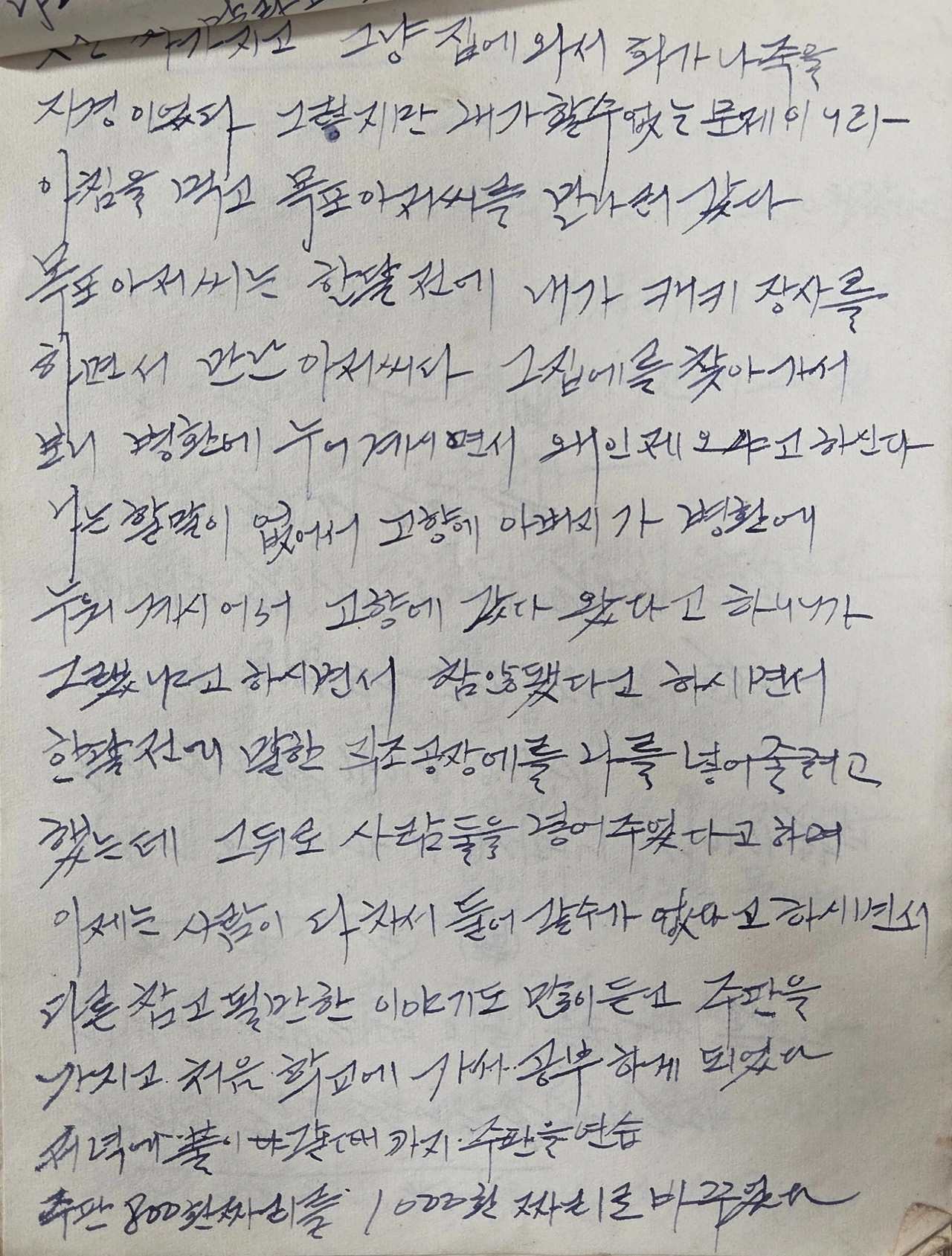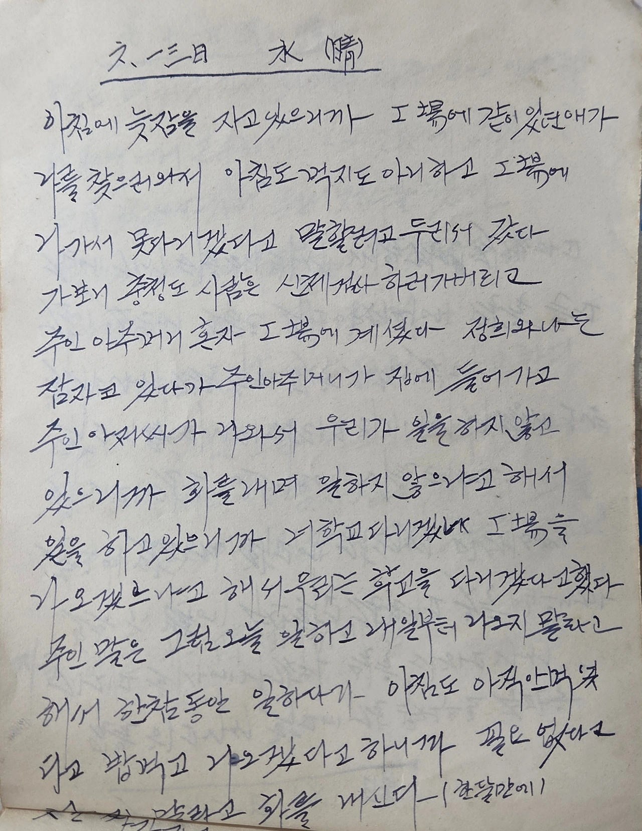아침에 늦잠을 자고 있으니까 공장에 같이 있던 애가 나를 찾으러 와서 아침도 먹지도 아니하고 공장에 나가서 못 다니겠다고 말할려고 둘이서 갔다. 가보니 충청도 사람들은 신체검사 하러 가버리고 주인아주머니 혼자 공장에 계셨다. 정희와 나는 잠자고 있다가 주인아주머니가 집에 들어가고 주인아저씨가 나와서 우리가 일을 하지 않고 있으니까 화를 내며 일하지 않으냐고 해서 일을 하고 있으니까 너 학교 다니겠냐 공장을 나오겠느냐고 해서 우리는 학교를 다니겠다고 했다.