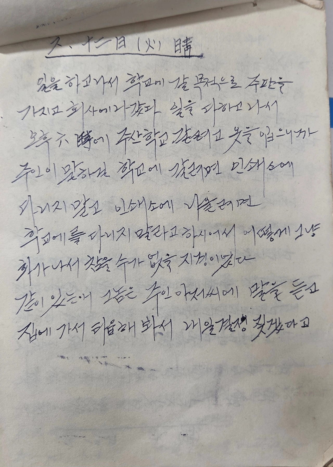 일을 하고 나서 학교에 갈 목적으로 주판을 가지고 회사에 나갔다. 일을 다 하고 나서 오후 6시에 주산학교 갈려고 옷을 입으니까 주인이 말하길 학교에 갈려면 인쇄소에 다니지 말고 인쇄소에 나올려면 학교에를 다니지 말라고 하시어서 어떻게 그냥 화가 나서 참을 수 없을 지경이었다.