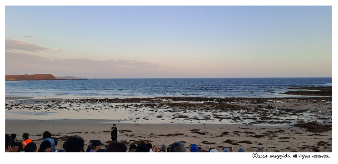 해안 데크에는 이미 많은 사람들이 자리를 잡고 있었다. 해질 무렵이라 바람이 더욱 차게 느껴졌다. 주섬주섬 가방에서 점퍼를 꺼내 입고 모자까지 덮었지만 추웠다. 우리는 서로 바짝 붙어 앉아 조금이라도 추위를 이겨보려 노력했다. 사진을 찍어도 안되고, 큰 소리를 내서도 안된다는 안내를 듣는 동안 해가 저물어 저물어 갔다. 펭귄을 위해 조명도 최소한으로 켜놓아 저 멀리 바다는 새카맣게 보였다. 저런 어둠을 뚫고 펭귄을 어떻게 집을 찾아오나 신통방통했다.
