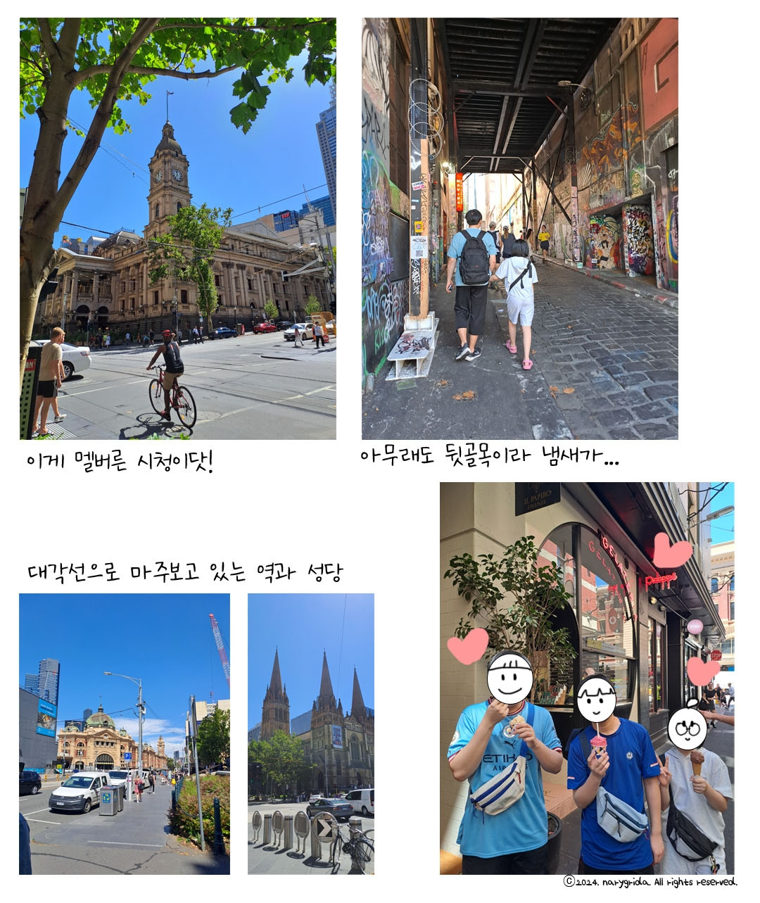 오늘의 일정은 우리 맘대로 멜버른 시티 투어다. 오후에는 돌풍과 비예보가 있어 서둘러 숙소를 나왔다. 드라마로 유명해진 호시어 레인(Hosier Lane)에서 인증사진을 찍고 세인트 폴 대성당(St Paul's Cathedral)과 플린더스 스트리트 기차역(Flinders Street Railway station)으로 향했다. 끝없이 뜨거워지는 햇살도 피할 겸 성당 안으로 들어가 잠시 앉아 쉬었다. 성당 곳곳에 폭죽 장식과 한문들이 보여 낯설었다. 호주에 정말 많은 이주자가(특히 중화권) 있음을 실감케 했다. 나와서 바로 길 건너편에는 호주에서 가장 오래된 기차역인 플린더스역이 있다. 옛 서울역을 떠올리는 외관이 고풍스러웠다. 내부도 들어가 기차가 어디 어디 가나 노선도와 함께 가격표를 살펴보았다.