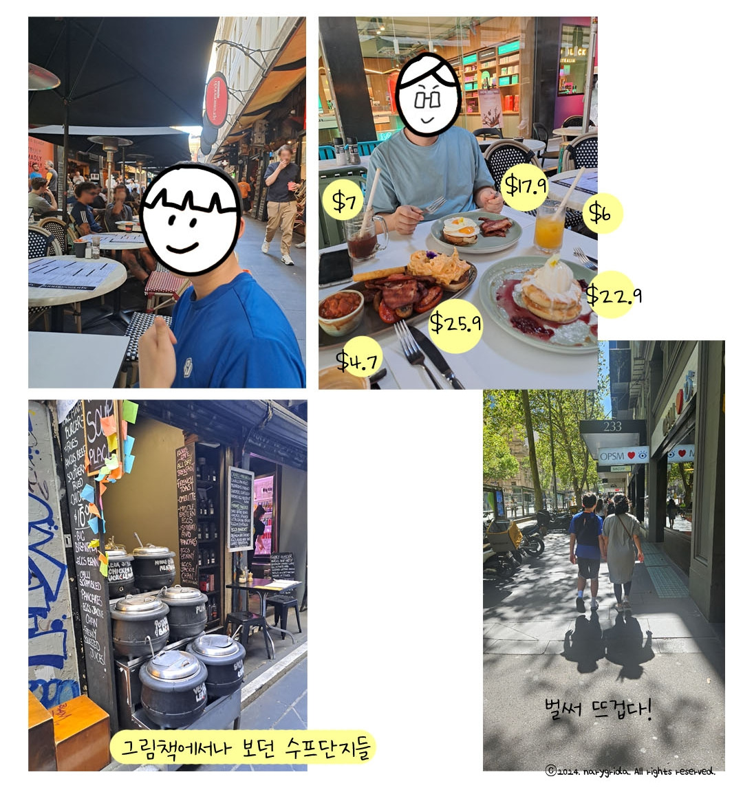 호주가 커피와 브런치 문화가 발달했다는 말에 기대가 컸는데 드디어 경험하게 되어 제법 설렜다. 숙소 뒷골목이 온통 아침식사를 파는 카페와 가게들이 가득했다. 그림책에서나 볼 법한 솥에 수프를 파는 가게도 있고, 한식 메뉴를 파는 가게도 있었다. 길 한가운데 식사를 할 수 있는 테이블과 의자가 준비되어 있었고 양 옆으로 가게들이 줄을 지어 있었다. 셋이서 앉을 수 있는 자리를 찾아 앉으니 해당 가게의 점원이 메뉴판이 가져다주었다.