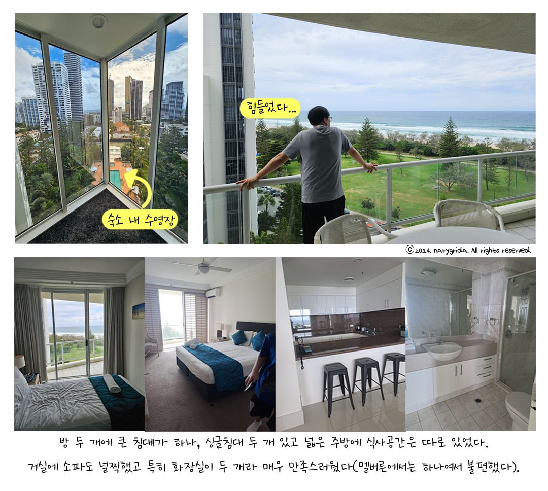 버스에 내려 짐을 끌고 숙소로 이동하는 길 조심스레 남편에게 무슨 문제가 생긴 거냐며 물었다. 아까 버스에서 남편은 숙소홈페이지 공지사항에서 우리 예약내용과 다른 내용이 발견되어 숙소 예약이 제대로 된 건지 자신이 없다고 했다. 최악의 경우 다른 숙소를 찾아야 할지도 모른다고 말했다. 제발 제발을 마음속으로 빌며 가방을 이끌고 숙소로 향했다. 다행히 우려했던 사태는 발생하지 않았고 활짝 웃는 얼굴로 키를 받아 10층 방으로 올라갔다. 거실에서 보이는 바다뷰가 맘에 들어 예약했던 숙소였는데 사진 그대로였다. 아이들은 환호성을 지르며 뛰어들어갔다.