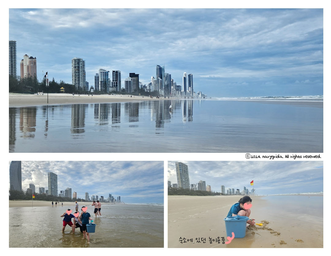 구름이 많긴 했지만 놀기에는 문제가 없었다. 끝도 없이 펼쳐진 모래사장과 해변을 따라 늘어서있는 고층건물들이 놀랍기만 했다. 그레이트 오션로드와 또 다른 바다의 모습이었다. 왜 이곳이 황금해안이라 불리는지 스스로 증명하고 있었다. 정말 고운 모래와 놀기 딱 좋은 수온에 아이들은 바다로 뛰어들었다. 모래사장에 앉아 아이들이 뛰어노는 모습을 흐뭇하게 바라보고 있노라니 절로 미소가 나왔다.