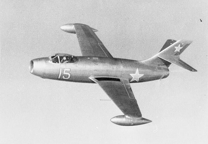 한편, Yakovlev에서 제트 전투기 제작에 착수하기 전인 1945년 1월 소련은 Mikoyan-Gurevich(MiG)에는 독일의 BMW 003 엔진 2개를 탑재한 제트 전투기를 만들라는 명령을 한다. 이에 미그 설계국은 1945년 말부터 시제기 생산에 들어갔다. 처녀비행은 1946년 4월 24일에 실시했으며 Yak-15에서 이야기했듯이 동전 던지기로 소련 최초의 제트 전투기가 되는 영광을 차지할 수 있었다.