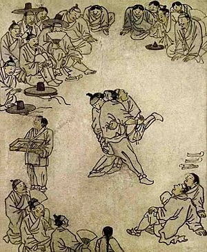샅바를 꽉 쥐자마자 드는 전광석화와도 같이 순식간에 상대를 쓰러뜨리려는 수완이 몸 속 아드레날린, 도파민을 사정없이 자극해 흥분이 최고조에 달하다가 수없이 자빠뜨리고 나동그라지는 통에 으적으적 씹히는 씨름판 모래 맛에서 승리의 쾌감에 비례해 지체없이 패배에 승복하는 미덕을 체득하는 것. 씨름의 묘미를 진즉에 알아챈 이들에게 영광 있으라!