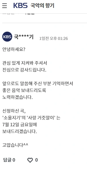 그런데, 그 요행이 곧 이뤄질 판이다. 일전에 KBS클래식FM <국악의 향기>란 프로그램 청취자 게시판에다 사연과 신청곡을 올렸다고 했었다.(7/5 글) 이후로 혹시나 해서 게시판을 다시 찾았더니 그 글을 읽은 프로그램 담당자가 댓글을 달았다! 그 댓글엔 내일, 그러니까 7/12(금) 방송 중에 신청곡을 보내주겠다는 내용도 담겨 있다!