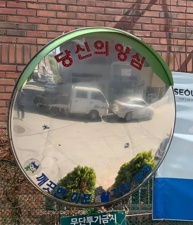 마포구에 위치한 어느 길목에는 사람들이 종종 쓰레기를 무단 투기하는 곳이 있다. 이에 참다 못한 공무원들은 큰 거울을 달아 놓고 거기에 붉은 글씨로 "당신의 양심"이라고 써 놓았다. 왜 양심 혹은 가슴은 늘 붉은색인가. 하여튼, 이곳에 몰래 쓰레기를 버리러 온 사람은 그 큰 거울을 마주 보게 되며, 그 거울 속에는 쓰레기를 버려는 자신이 비치게 된다. 당신의 양심이라는 크고 붉은 글씨와 함께. 이것은 21세기 한국형 파놉티콘이 아닐까. 쓰레기를 버리려고 이 자리에 온 사람은 감시자를 보는 대신, 쓰레기를 손에 든 자기 자신을 본다. 할 수 없이 본다. 이 역시 외부 메커니즘을 통해 강제된 자기 통제이며, 그런 점에서 마포구의 쓰레기 투기 지역 큰 거울은 자기 감시의 메커니즈을 강제하는 장치이다.(같은 책, 170~171쪽)