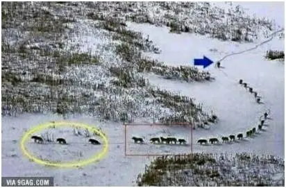 몇 년 전 SNS 상에서 화제가 됐던 사진은 눈 덮인 산을 한 줄로 서서 걸어가는 한 늑대 무리를 찍은 것이었다. 누군가 '늑대에게서 배우는 삶의 지혜'라는 글로 사진을 친절하게 설명했는데 다음과 같은 내용이었다.