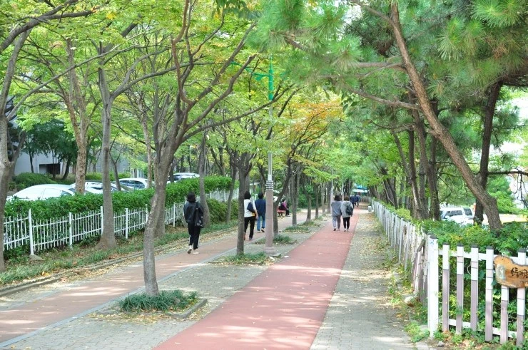길은 지하철역 쪽 어귀로부터 걸어갈수록 경사가 완만하게 올라간데다 약간 휘어져 나있다네. 행인들 오고가기 편하게 두 길로 나눠졌고 길바닥은 폭신한 탄력이 그만이지. 나눠진 길 사이 공간으로 가로등과 느티나무가 일정한 간격을 두고 줄지어 서 있어. 길 양 가장자리는 이름 다른 아파트 단지가 서로 마주보고 서있고 조경 차원에서 심었을 다채로운 아름드리나무들이 길 가운데 가로등, 느티나무와 연리지마냥 가지와 잎들이 맞닿아서 천연 아치를 이루며 행인을 내려다본다네. 흩뿌리던 는개가 머금은 안개는 가로등을 휘감아 음산한 코발트빛을 분사시키니 그 기이한 풍광에 나는 왜소한 몸뚱아리를 나부죽이 부복하여 순종하고 말았네. 야밤의 고적함이 거역하기 힘든 그들의 위엄을 시샘하듯 알싸한 밤내음을 뿜어대는 도상에서 나는 말로 표현 못할 청량감에 취했네. 가슴에 덕적덕적 껴 있던 잡된 상념의 더께를 훌훌 털어내 나신裸身이 된 듯 홀가분해진 나는 그들이 내뿜는 경이로운 기운을 온몸으로 받아 안아 마침내 정화되었지!