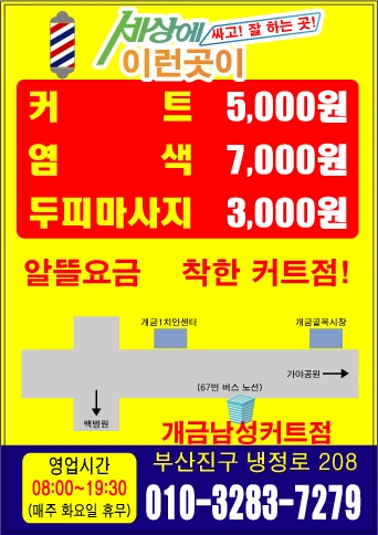 내일 가오픈하지만 가오픈이라고 해서 워밍업 삼아 설렁설렁 시간만 축낼 까닭이 없다. 손님 들어오면 들어오는 대로 받아 취향에 맞게 커트하고 염색해 주는 그저 일하는 날의 첫날일 뿐 다른 의미란 없다. 동네에 뿌릴 전단지는 부친의 의중에 따라 눈에 확 뜨이는 원색으로 촌스럽게 만들었다. 커트 5천 원, 염색 7천 원, 두피마사지 3천 원. 요금은 간단하다. 전단지 디자인이 촌스러워 디다보고 요금이 싸니 한번 더 디다보면 궁금해서라도 가게 들르게 되어 있다고 경험에서 우러난 부친의 주장이시다.