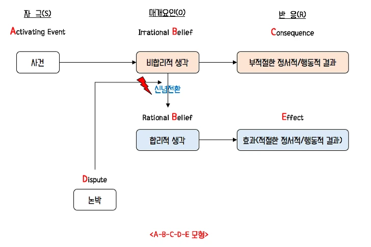 직업상담사 자격증 공부를 한창 할 무렵 봤던 한 상담심리 모형이 여전히 뇌리에 박혀 있다. 나도 정신적으로 썩 무던한 편은 아니지만 대화를 나누다 은연중에 드러나는 상대의 심상찮음, 앞으로 소개할 상담심리 모형의 용어로 바꿔 말하자면 '비합리적 신념체계'를 발견했을 때 내가 어떻게 대응할 것인지에 대한 좋은 길라잡이 역할을 해준다. 앨버트 엘리스라는 심리학자가 고안했다는 《인지 정서 치료(RET: Rational-Emotive Therapy)》에는 항목의 앞 글자만 따 <ABCDEF 모형>이라고 명명한 재밌는 이론이 있다. 예를 들면 이렇다.