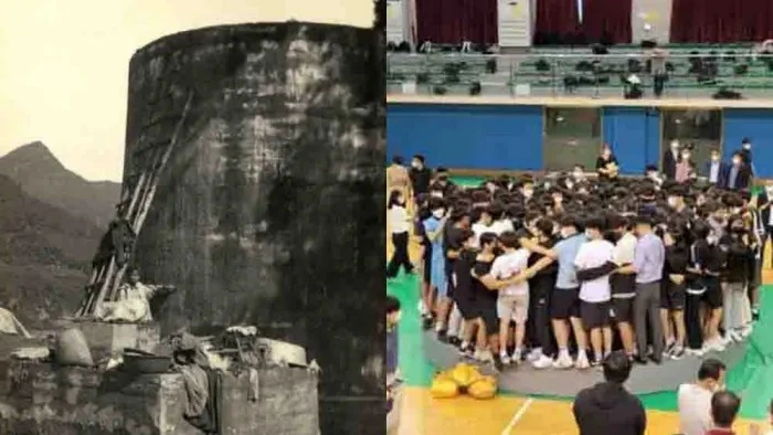 2. 1972년 8월 19일 태풍 피해 당시 시루섬 마을 주민들이 올라가 몸을 피한 물탱크 모습과 50년 후인 지난 7월 21일 단양읍 문화체육센터에서 단양중 학생 197명이 시루섬 모형 물탱크에 올라가 버티는 실험을 하는 사진.