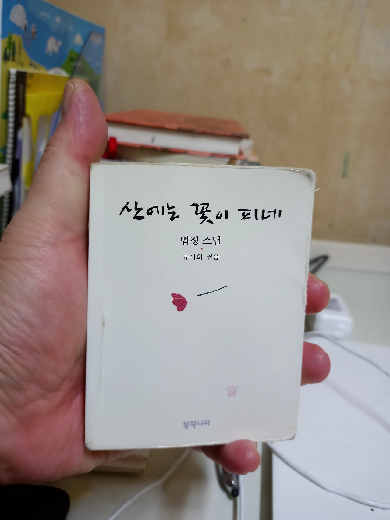 엊그제 식탁에 올려져 있던 그 책은 다름아닌 집 어딘가에서 굴러다니던 포켓북, 법정 말씀을 류시화가 엮은 『산에는 꽃이 피네』(동쪽나라)였다. 마누라의 인정 사정 없는 폐기 처분 작업에서 비껴간 게 그 책의 요행이라면 요행이겠지만 『무소유』로 대표되는 법정의 사상에 진작에 매료되었던 나로서는 그 손바닥보다 작은 포켓북 속에 담긴 법정의 또다른 웅숭깊은 사유의 아우라 때문에 마누라가 쓰레기통에 함부로 던지지 못한 게 아닌가 하고 혼자 상상의 나래를 펼치다가 귀한 양서를 손에 쥔 뜻밖의 행운에 쾌재의 미소가 절로 나오는 걸 마누라한테 들키기 싫어서(뺏길까봐) 그길로 내 방으로 슬쩍 들어가 버렸다.
