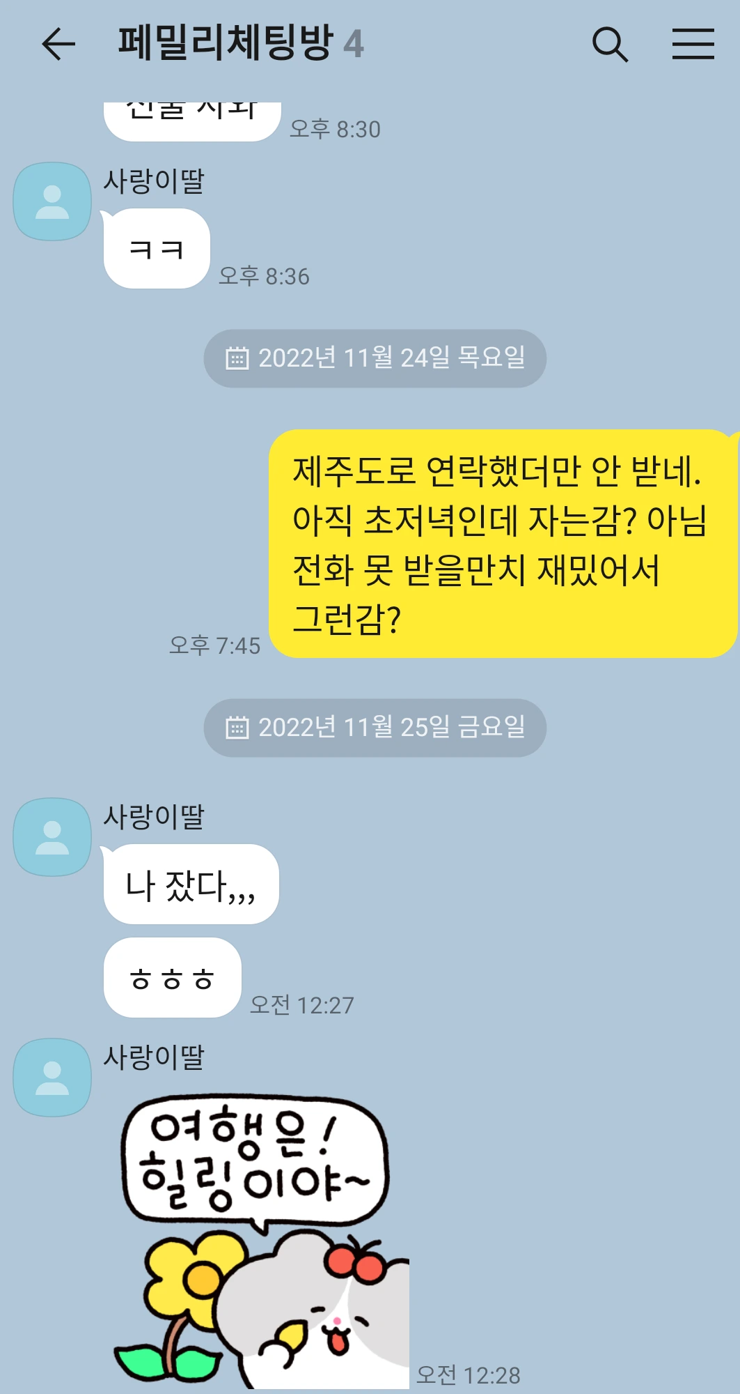 딸아이들이 어디로 누구랑 가든 일단 허락했으면 집에 돌아올 때까지는 일절 간섭을 안 하는 편이지만, 그제 저녁에는 무슨 바람이 불었는지 큰딸한테 전화를 걸었었다. 헌데 목소리를 못 들었다. 가족톡에다가 얼마나 재미지면 전화도 못 받느냐며 투정부리듯 메시지를 남겼는데도 묵묵부답. 귀가해서 늦은 저녁을 먹고 나서 다시 전화를 해도 안 받고, 잠자리 들기 직전에 전화를 해도 안 받고, 초저녁에 남긴 가족톡조차 안 보면 뜨는 노란 숫자가 여전히 그대로라 슬그머니 애간장이 타들어갔다.