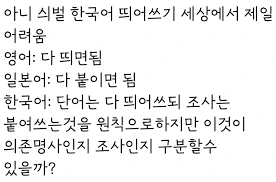 띄어쓰기가 어렵다고 느끼는 까닭은 띄어쓰기 규정에 이미 드러나 있다. 띄어쓰기 규정 제1장 제2항 '문장의 각 단어는 띄어 씀을 원칙으로 한다'고 되어 있는데 '원칙으로 한다'는 '예외가 있다'는 뜻이고 그 예외란 게 너무 많고 종잡을 수 없기 때문에 띄어쓰기가 어렵다.