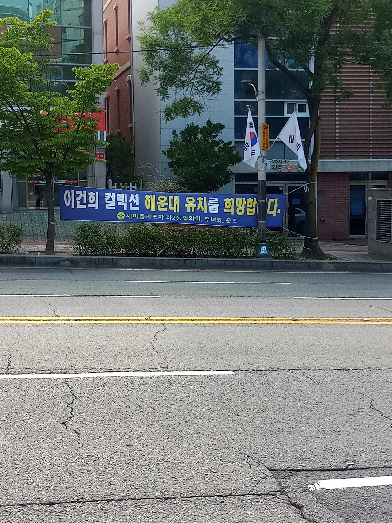 문화체육부가 서울 송현동과 용산 부지를 '국가기증 이건희 소장품관'(이하 이건희 미술관) 건립 후보지로 압축했다고 밝혔음에도 지자체(해운대구) 및 지역협의체가 내건 미술관 유치를 기원하는 현수막은 눈에 잘 띄는 곳에 여전히 걸려 있다.