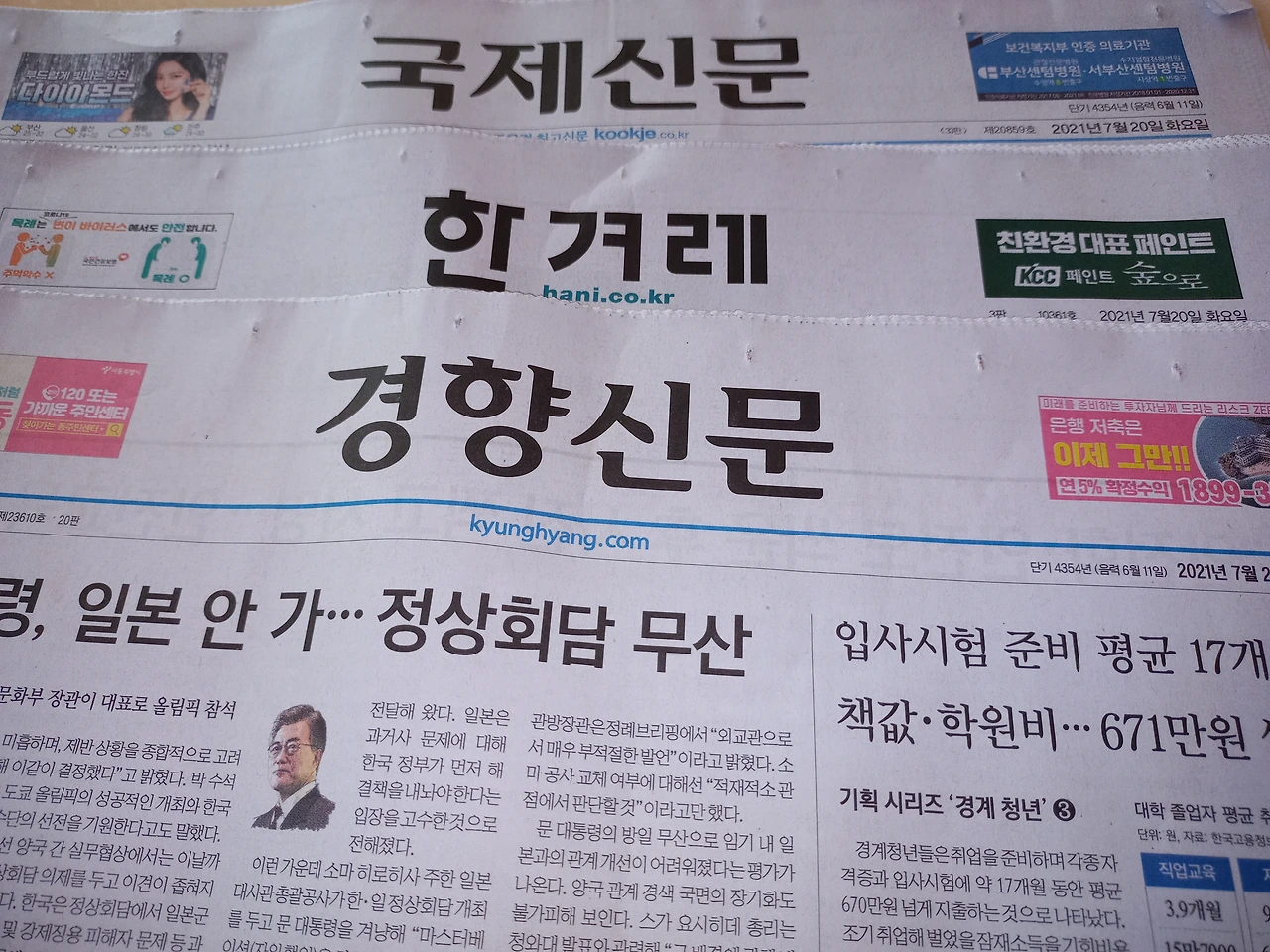일간지를 3부 받아 본다. 경향, 한겨레는 구독한 지 10년이 넘었고 나머지 1부는 동아일보였다가 한국일보로 바뀌고 지금의 국제신문으로 갈아탄 지 2년쯤 된다.