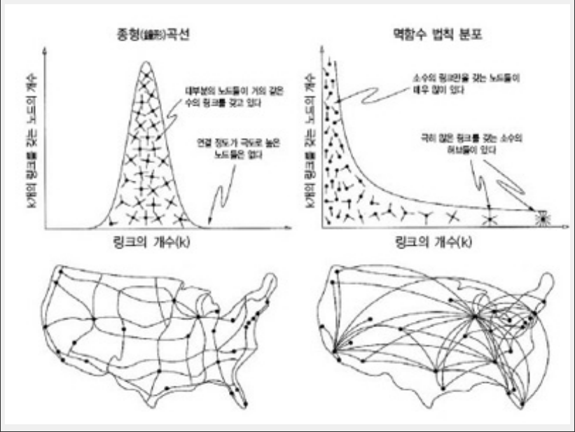 앞서 살펴본 생각의 전파도 사람들의 키 분포처럼 최빈값을 중심으로 고고루 퍼지기보다는 연예인들의 수입이나 공항의 연결처럼 아주 큰 값을 갖는 소수와 아주 작은 값을 갖는 다수로 나뉩니다.