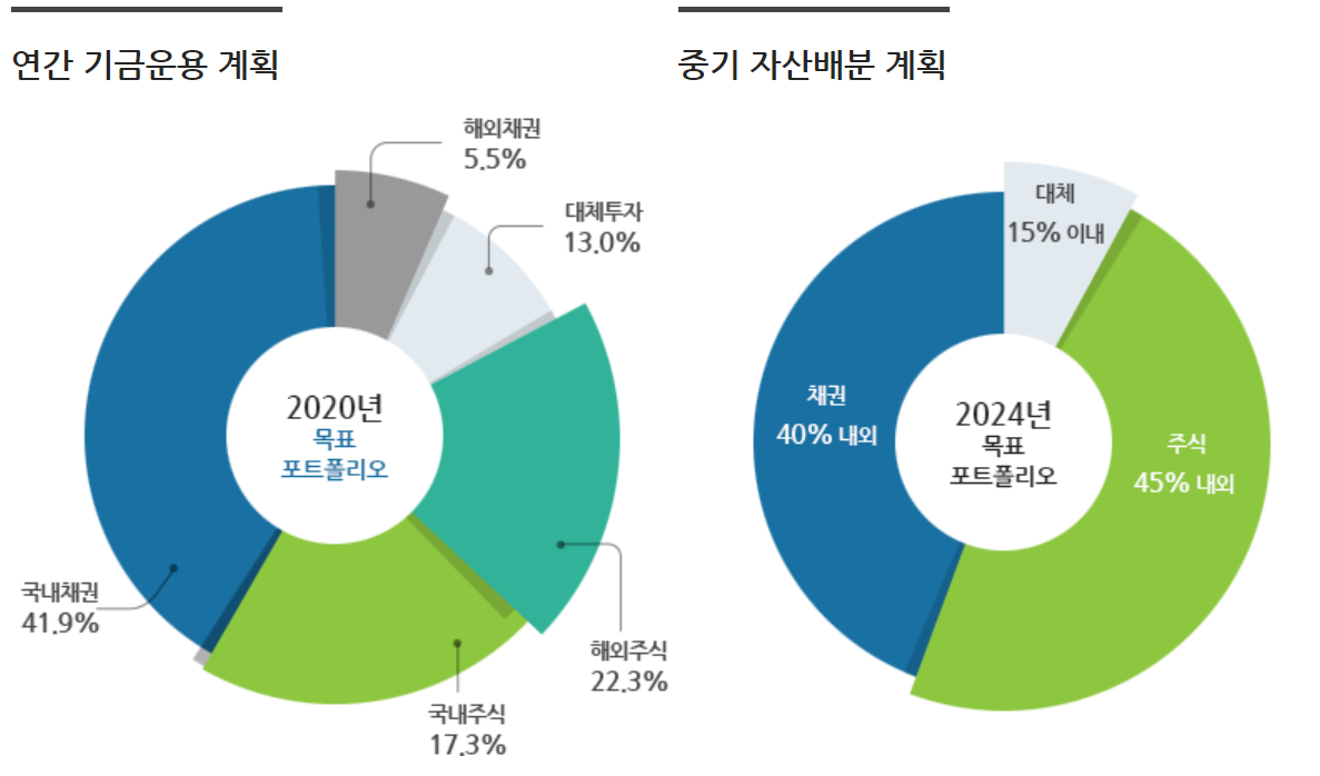 우리나라 국민연금의 경우 다음의 그림과 같이 국내 주식에는 전체 자금 중 17.3%, 해외 주식에는 22.3%만을 투자하는 것을 원칙으로 함을 알 수 있습니다.