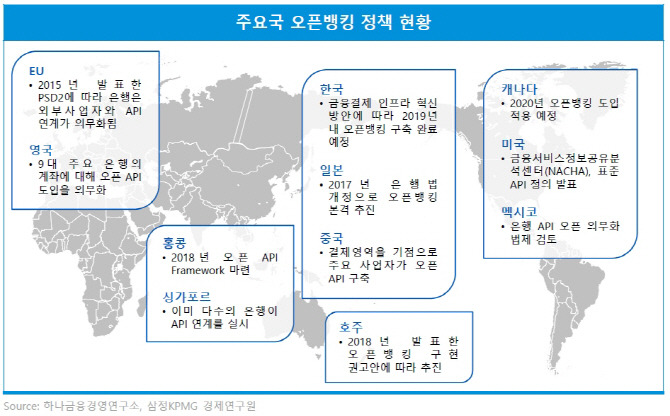 국내에서도 2019년 10월 시작된 오픈뱅킹 서비스는 핀테크(FinTech) 기업들과 시중은행들이 금융결제원에서 제공하는 오픈 API와 공동결제시스템을 이용하여 하나의 금융기관 시스템에서 다른 모든 은행계좌의 조회, 이체, 결제 등을 처리할 수 있도록 만든 서비스를 의미합니다.