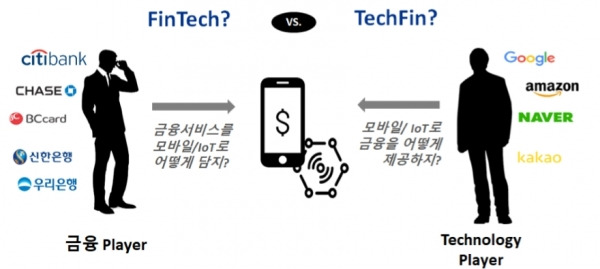 이제는 모르는 사람이 더 드물어진 단어인 핀테크(FinTech)는 Finance와 Technology의 합성어로써, 금융회사가 주체가 되어 사람들이 필요로 하는 금융 서비스를 IT 기술을 이용해 제공하는 것을 의미합니다. 테크핀(TechFin)은 단어의 위치가 바뀐 것에서 알 수 있듯이 금융회사가 아닌 기존 IT기업들이 주체가 되어 자신들의 IT 서비스에 고객들에게 필요한 금융 서비스를 구현하여 제공하는 것을 뜻합니다.