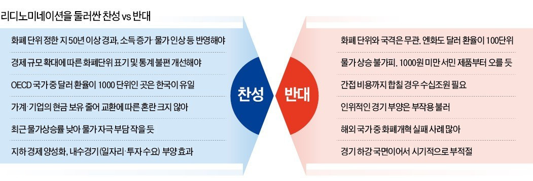 우리나라에서도 화폐의 단위를 바꾸는 리디노미네이션에 대한 논의가 최근에 있었던 것으로 알고 있습니다. 현재 미국의 1달러가 우리나라 돈으로는 무려 1200원 정도 하다 보니 계산이나 거래에 불편하다는 의견도 있고, 위에서 제가 설명드린 바와 같이 숨겨져 있는 (비자금용) 현금들을 다 끄집어내어 경제 활성화를 시도하자는 의견도 있었습니다. 한국은행이 5만 원짜리 화폐를 발행해도 그것이 다 어딘가로 숨어버리는 현상을 막자는 것입니다.