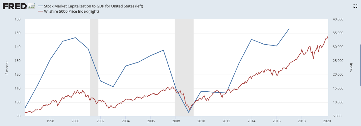 워런 버핏이 현재 증시가 거품 상황인지 아닌지 판단할 때 사용하는 것으로 알려진 지표는 GDP 대비 시가총액 비중으로 알려져 있습니다. GDP 대비 시가총액 비중은 주식회사들의 주식 가격의 총합과 그 회사들이 생산해내는 재화의 총합인 GDP와 비교를 하는 것입니다. 그래서 주식회사들이 그들이 생산해내는 재화의 총합보다 지나치게 높은 가격을 받고 있다면 증시가 과열 국면이므로 주의해야 됩니다.