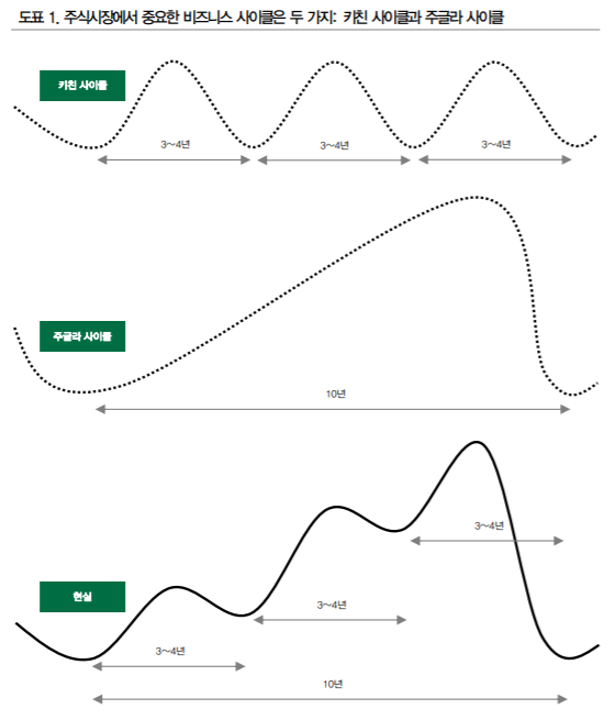 단기와 중기 순환 이론들의 개념은 위와 같이 분위기 좋을 때 사람들이 지나치게 욕심을 내다보니 다시 경기 침체를 만든다는 개념이 동일하다고 보시면 됩니다. 다만 어떤 분야에 적용되느냐, 어떤 요소에 의해 동작하느냐에 따라 그 특성이 다릅니다.