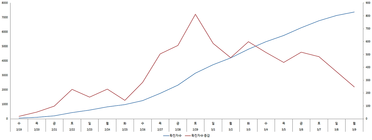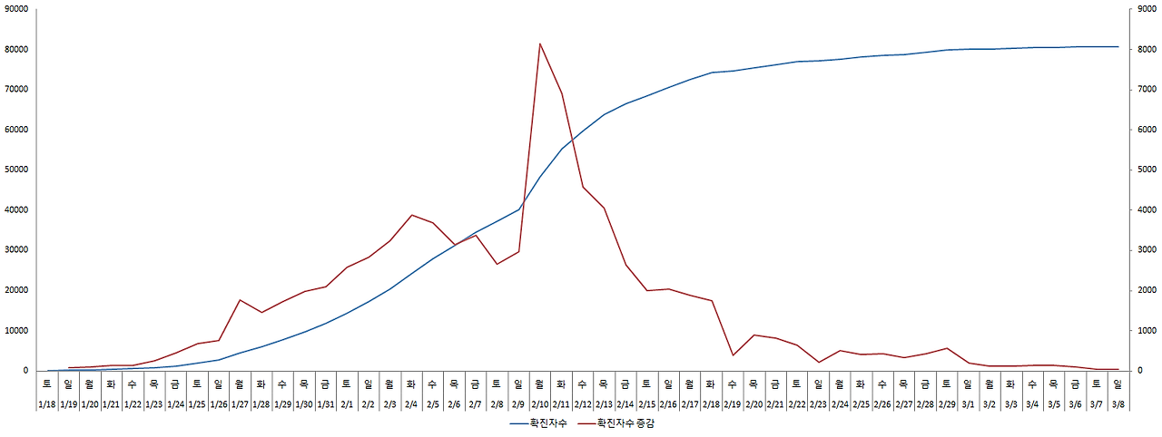 - (잠재적 무증상 감염자가 실제 확진자 수치보다 더 많을 것으로 보이지만) 중국과 한국의 데이터를 참고한다면 패닉이 발생하는 시점으로부터 3주-4주 정도 지나고 나면 확진자 증가가 감소하기 시작하고, 패닉도 수그러드는 것으로 보임