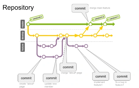 2) develop branch: 개발 중인 버전의 소스 코드가 담겨 있음, 여기서 충분한 테스트와 새로운 버그 발견 후에 master로 이동 가능