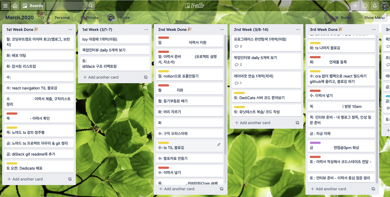 열심히 달려온 그 페이스를 잊지 않기 위해 트렐로에 하루 일정을 계획하고 실천해 나갔다. 어차피 언제 끝날지 모르는 '구직 활동'이므로 내가 할 수 있는 가장 긴 예측은 [주 단위(week)]였다.