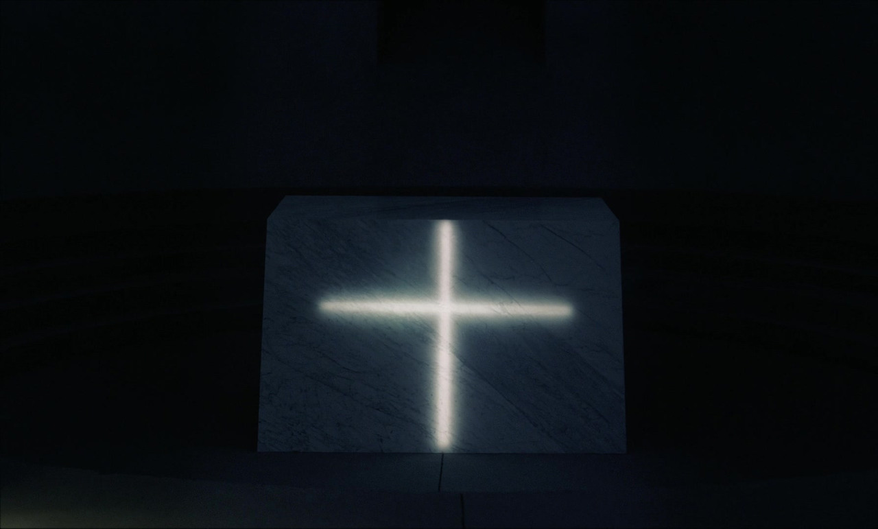 한편, 처음(Α)에는 그녀의 뒤로 밝은 자연 풍광/햇빛이 비치는 창문의 십자가 창살이 역광을 받아 그림자처럼 어둡게 보였는데요. 마지막(Ω)에는 어두운 커뮤니티 센터 속 대리석조각 옆면에 역으로 뚫린 천장의 창문을 통과한 십자가 빛이 밝게 비춰지더군요. 어쩌면 이 영화는 빛을 쫓으며 뿌리를 내리지 못한 채, 물 위를 유랑하듯 떠도는 유목민들의 어두운 이면, 즉 빛과 그림자에 대한 이야기를 전한 것일지도요.