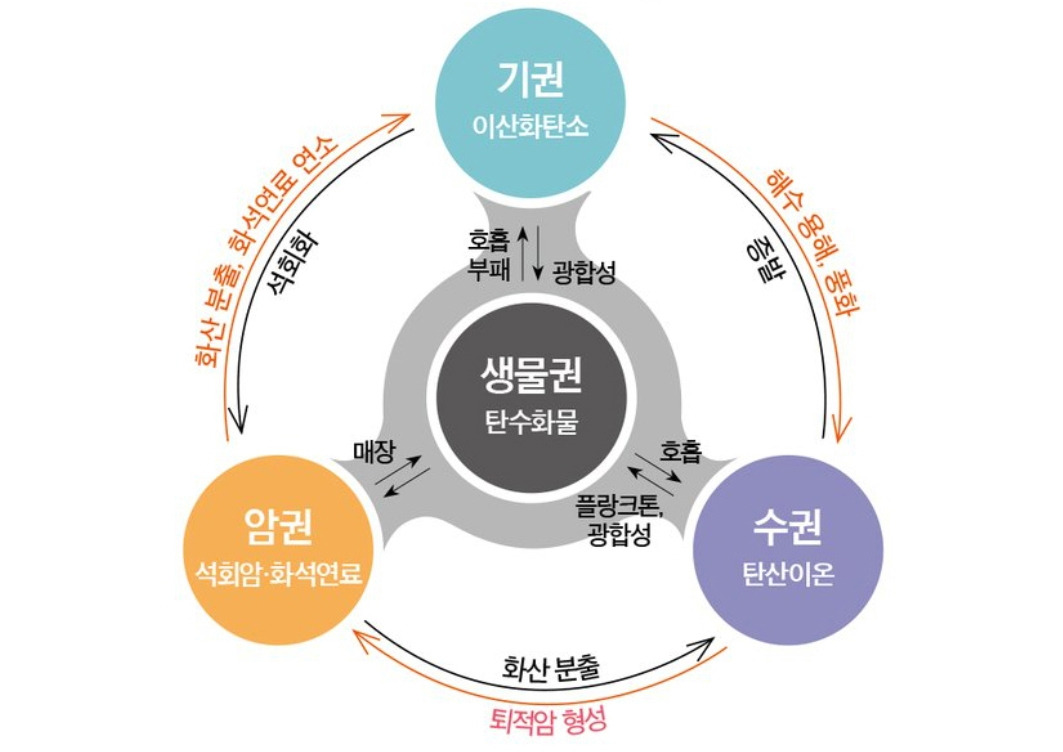 또한 탄소는 공무원 아저씨 펀 그라우치드의 연구실에 있는 식물들을 비롯하여, 꼬맹이 클로드의 겨드랑이에서 솟아난 꽃, 비비스테리아 나무처럼 동식물의 활동에 의해서 물(수권), 공기(기권), 땅(지권) 곳곳에 퍼지게 된답니다.