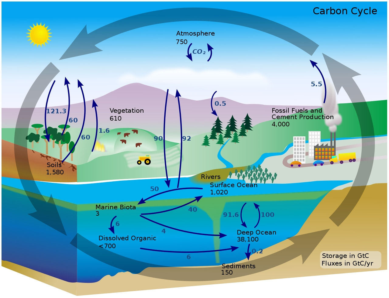 최근에는 지구 온난화나 에너지 고갈 문제과 같은 기후변화에 직면하여, 아래와 같이 탄소 순환체계에서 연간 탄소 이동량을 측정하기 시작했습니다. 그리고 각 나라/도시별로 배출하는 탄소량과 제거ㆍ흡수하는 탄소량을 최대한 같게 만드는 탄소중립을 정책목표로 삼고 있지요. 도시 건축 분야에서는 주로 제로에너지건축물(ZEB)이나 저영향개발(LID) 기법을 도입하고 있답니다.