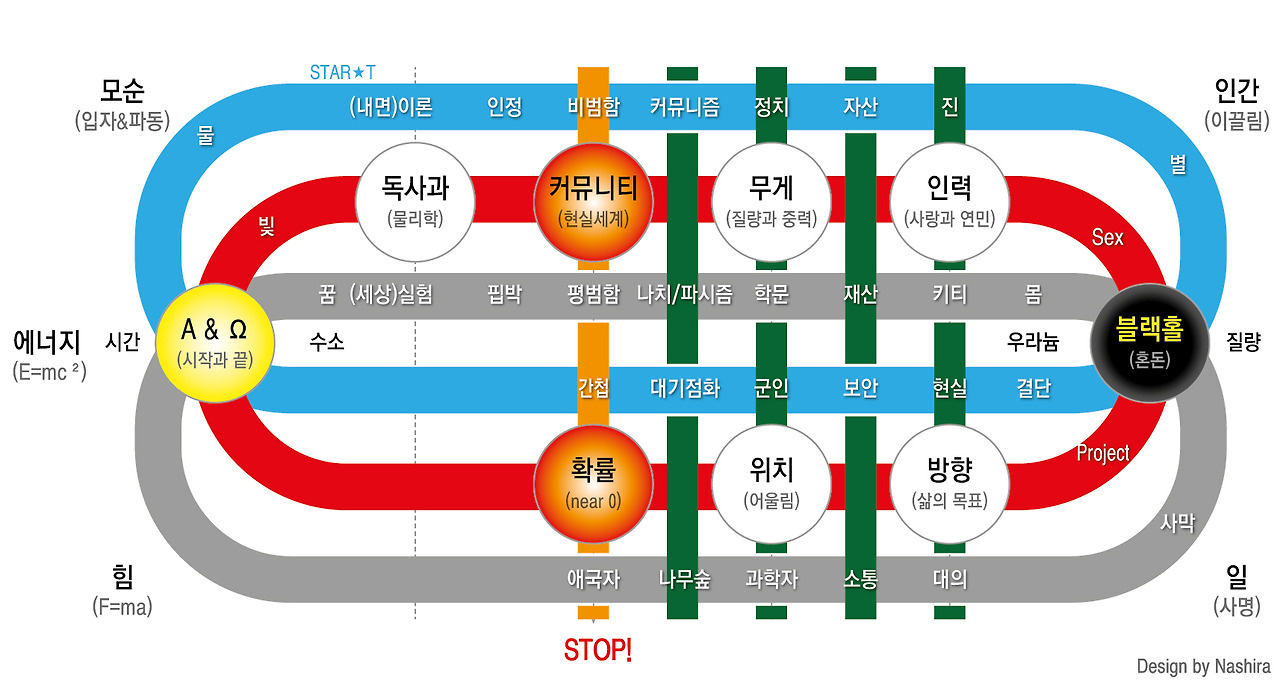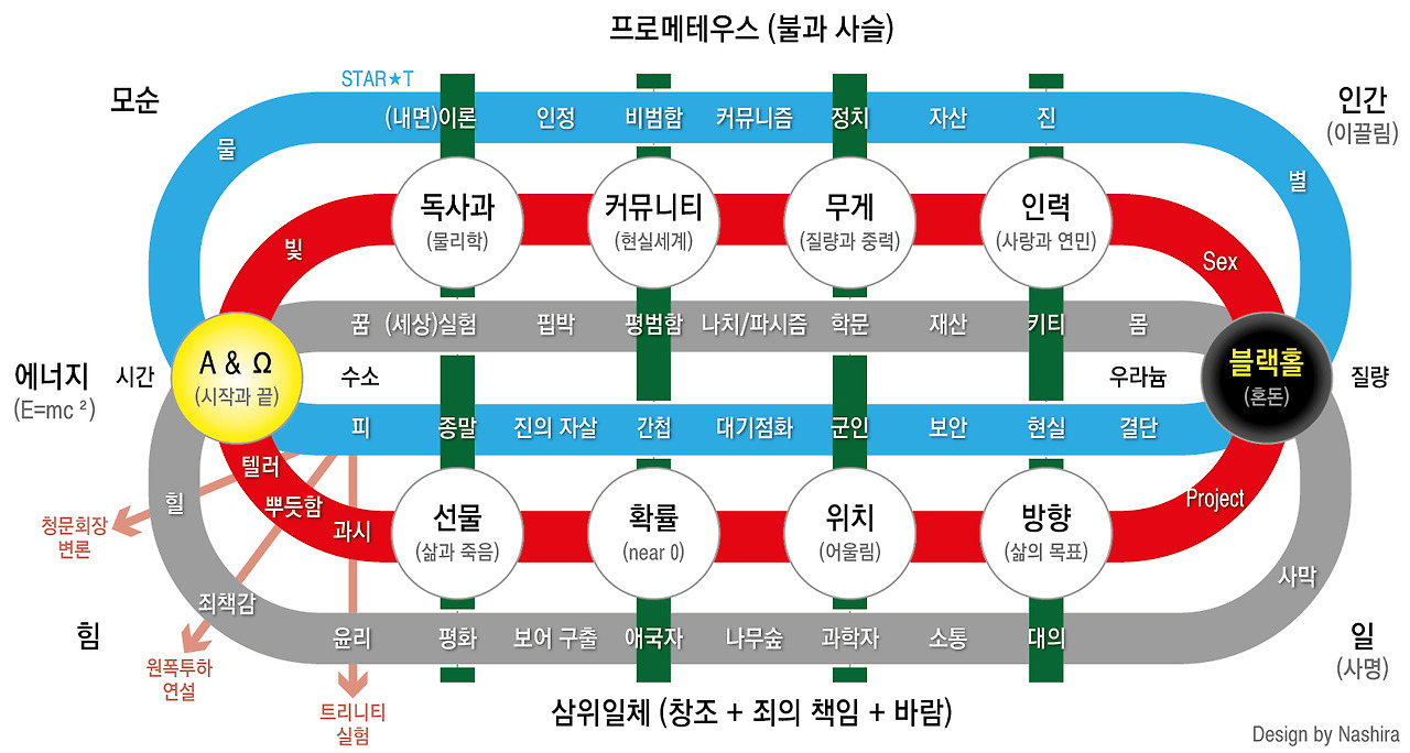 그리고 여기서부터 영화의 내용은 오피가 수행한 프로젝트 궤적을 이어가지 않고, 기존 플롯에서 다룬 오피의 속성/이슈들이 재등장합니다. 켤레 복소수(complex) 그룹인 컬러청문회(오피)와 흑백청문회(스트로스)에서 다룬 내용들이 열(세로방향)로 엮이면서 마구 교환하는 것이지요. 참고로 전 다이어그램을 세로로 길게 작업했는데요. 이건 폰으로 볼 때의 가독성 때문에 돌려놓은 거였습니다. 키티의 명령에 따르면 아래처럼 가로로 긴 다이어그램이 맞을 듯하네요. 즉 영화는 ‘확률’이란 테마에서 잠시 플롯의 흐름을 멈추고, 기존 속성들끼리 서로 쇠사슬처럼 얽히게 됩니다. 진과의 불륜으로 오피가 두구두구 분열할 때까지요.