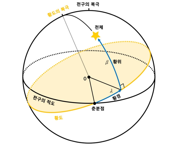 ※ 황경 : 지구(땅) 기준의 태양좌표계에서 태양이 황도(노란선)를 따라 움직인 경도(각거리) λ