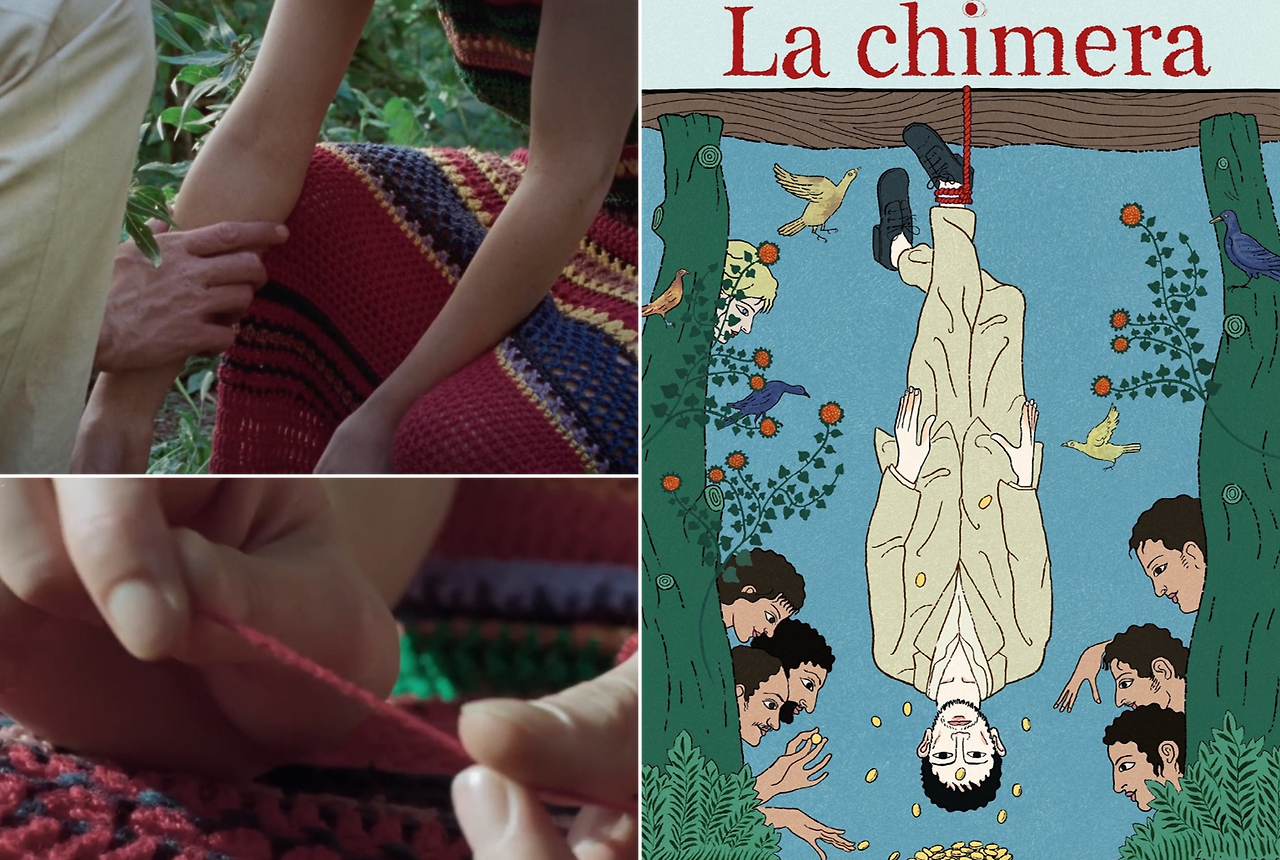 여러모로 <키메라>에는 마치 하늘과 땅의 대비처럼 하늘색(셔츠, 양말, 차량)과 노란색(꽃, 이탈리아와 스파르타코의 옷)이 자주 등장하고, 이 가운데 물은 하늘을 반전시키는 거울의 역할을 한다는 인상이 들었는데요. 아르투가 마치 남녀의 성기를 연상시키는 Y자 모양의 나뭇가지로 땅 속의 수맥을 탐지하던 것처럼 이 영화엔 땅과 물/하늘의 이미지가 겹쳐지며 음/양의 관계처럼 시점이 뒤집어지곤 합니다.