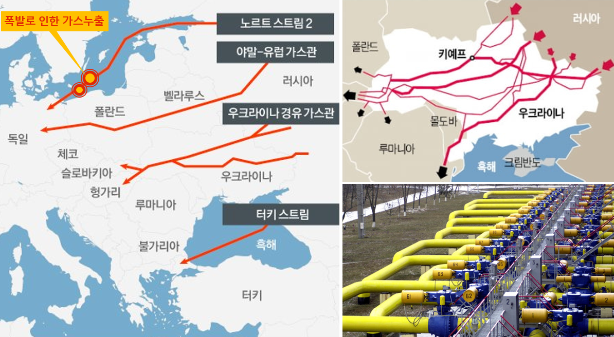 한편, 이 우크라이나 전쟁에서는 러시아~유럽대륙으로 천연가스 에너지를 운송하는 가스관(nord stream 등)이 꽤 중요한 이슈였는데요. 러시아-독일 간 가스관이 우크라이나 땅을 경유하고 있기에 자원이 일종의 인질이 되기도 합니다. 무엇보다 2022년 노르트 스트림 폭발 사건으로 해양 생태계가 작살이 났으나 아직 용의선 상의 국가 확정은 안되고 있습니다.