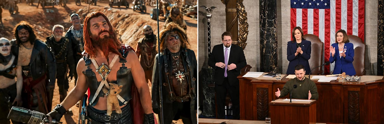이 영화에서 디멘투스는 시타델에 쳐들어가 임모탄 앞에서 말빨로 사람들을 설득하는데 실패합니다. 그러자 역사 속 스파르타가 그리스연합군을 끌어모으고 트로이 목마 전술로 잠입했던 것처럼 가스 타운을 차지한 뒤 임모탄과 다시금 협상을 진행하지요. 참고로 우크라이나의 질렌스키 대통령은 과거 코미디언이자 배우였던 연예인 출신의 정치인으로 연설을 상당히 잘하는 것으로 유명합니다. NATO(북대서양 조약기구) 가입은 지지부진하지만 왠지 EU(유럽연합) 가입은 곧 성공할 듯 싶더라는...