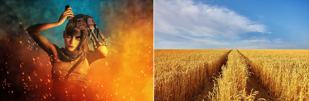 이 작품에서 퓨리오사는 황금빛 곡식/밀을 상징하는 북유럽신화 속 여신 시프(Sif)의 황금 머리카락처럼 풍성하게 자라난 머리카락을 두번 삭발하는데요. 유럽의 곡창 지대로 국기에까지 황금빛 밀(+불)과 하늘(+물)이 담겨있는 우크라이나는 2014년 러시아의 크림반도 합병 이후 분쟁이 시작되면서 2022년에 러시아의 침공으로 전면전이 터지게 되었습니다.