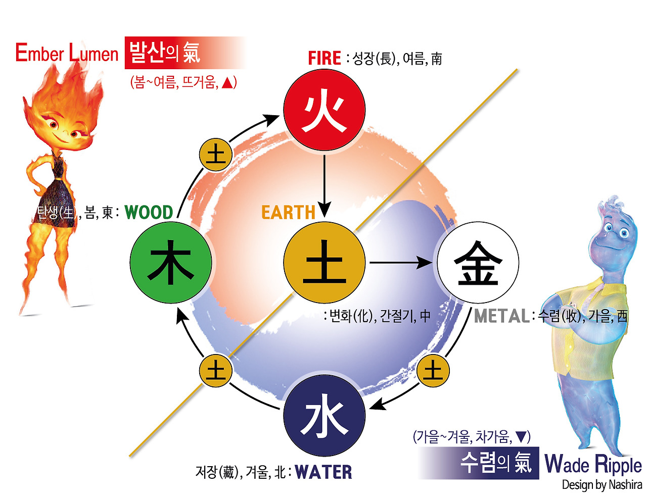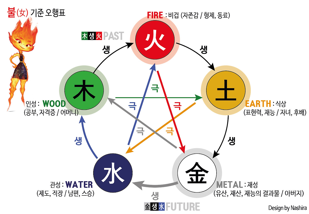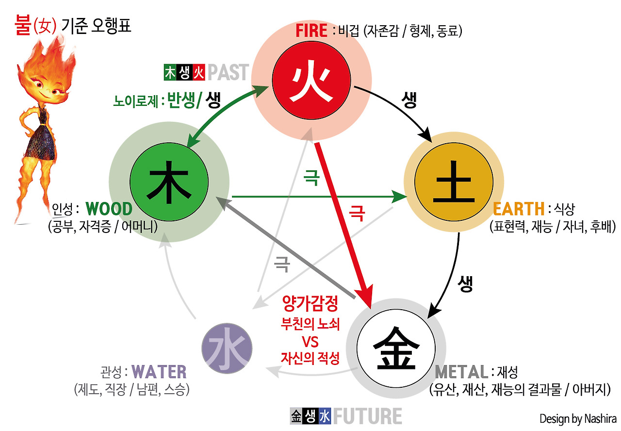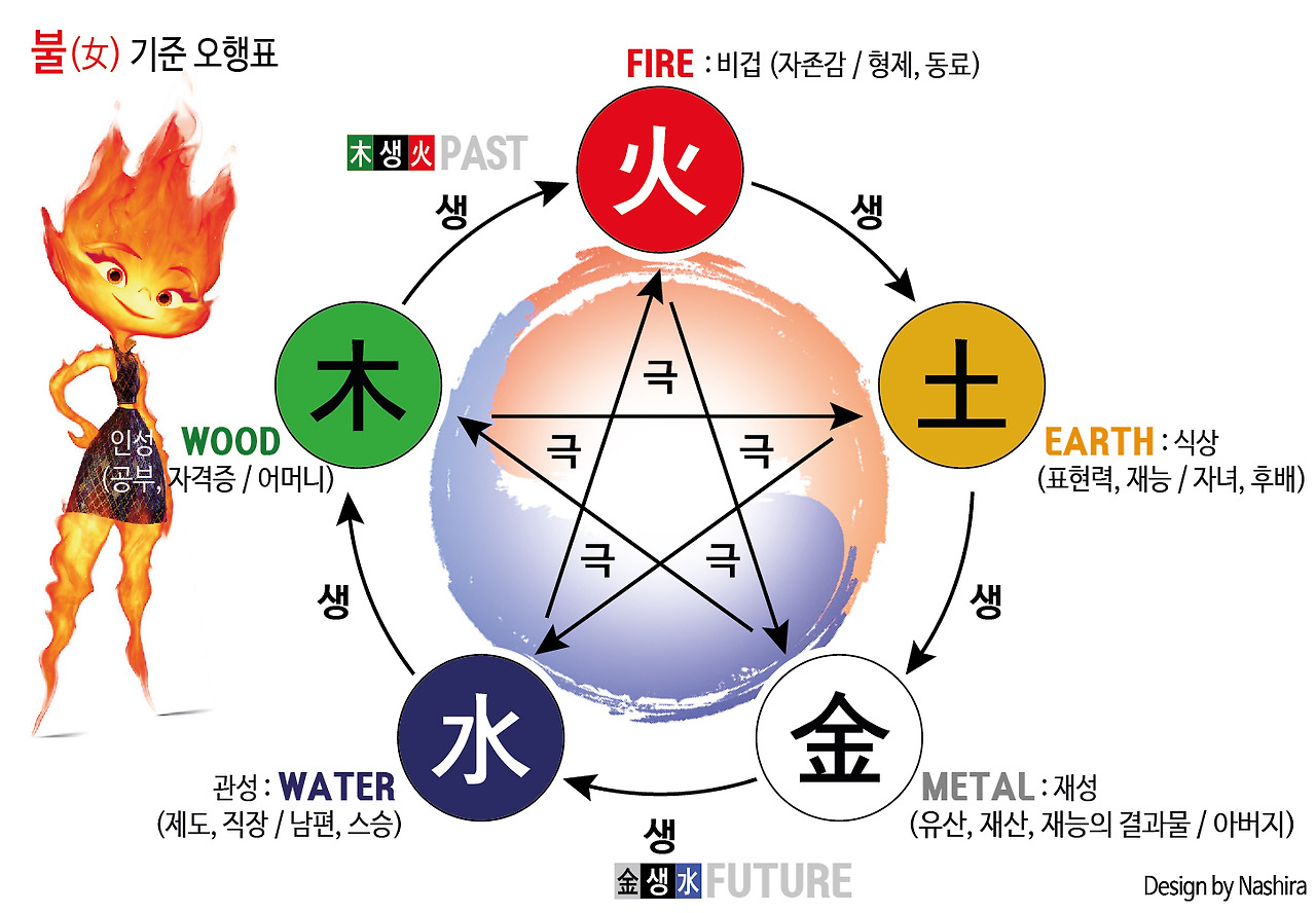 이번편에는 엠버 시점의 궁합을 간략히 다뤄보고, 다음편에서는 웨이드 시점의 궁합을 제대로 분석해볼게요. 영화에선 앰버네 엄마가 궁합을 봐주던데, 왜 웨이드 시점이 메인이냐구요? 그건 바로 제가 웨이드의 엄마와 같은 건축과 출신이기 때문이지요. 과학원리 시리즈에서 밝힌 것처럼 개인적으로 저는 <엘리멘탈>이 물순환체계와 탄소순환체계, 즉 기후변화 원리를 은유하는 영화라 생각하는데요. 특히 물은 이 나라의 현황을 보여주는 것으로, 어떻게 해야 건강한 환경이 되는지 알 수 있었답니다. 그리고 장작/숯이 타다 남은 잉걸불이란 뜻인 엠버(Ember)가 주인공인만큼 탄소(C)의 순환 이야기는 각잡고 오행의 순환편에서 다룰 예정입니다.