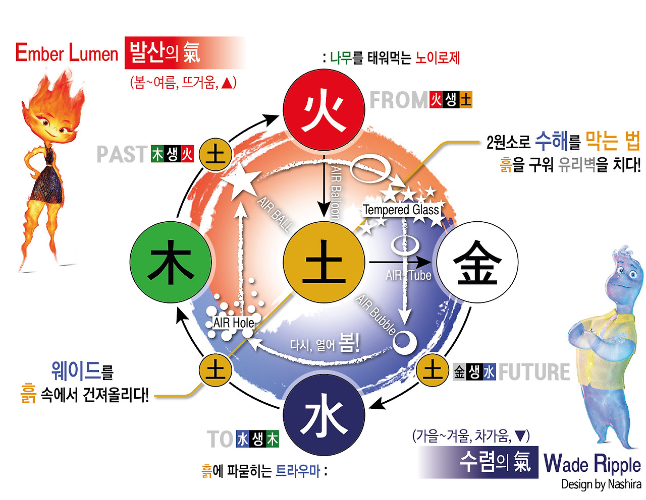 木, 土, 金은 단단한 형체가 있는데 반해, 火, 水, Air는 일렁이는 형체를 가졌기에 자유롭게 여기저기를 넘나들거나/뚫고 간다는 점에서 이 셋은 서로 닮아있습니다.