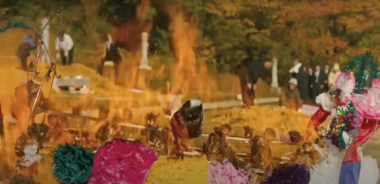 가을날, 할머니의 관을 장식한 알록달록 화려한 조화(가짜꽃)들이 불에 태워지며 사그라듭니다. 말녀가 죽자 집안에서 아슬아슬하게 지탱해온 화목한? 결속이 깨지고, 분쟁이 일어나는군요. 다함께 옹기종기 모여서 왁자지껄하다가도, 삼삼오오 모여서 숨통 트이는 하소연을 나누고 독립운동하는 것 마냥 형제 간에 작당모의하여 제사 시간을 저녁 9시로 당기던 옛 시절의 대화들. 그러나 할머니가 돌아가신 후에는 삼삼오오 모여 의심을 낳는 뒷다마를 양산하고, 형제들끼리 갈라서는 폭언이 오고가게 됩니다.