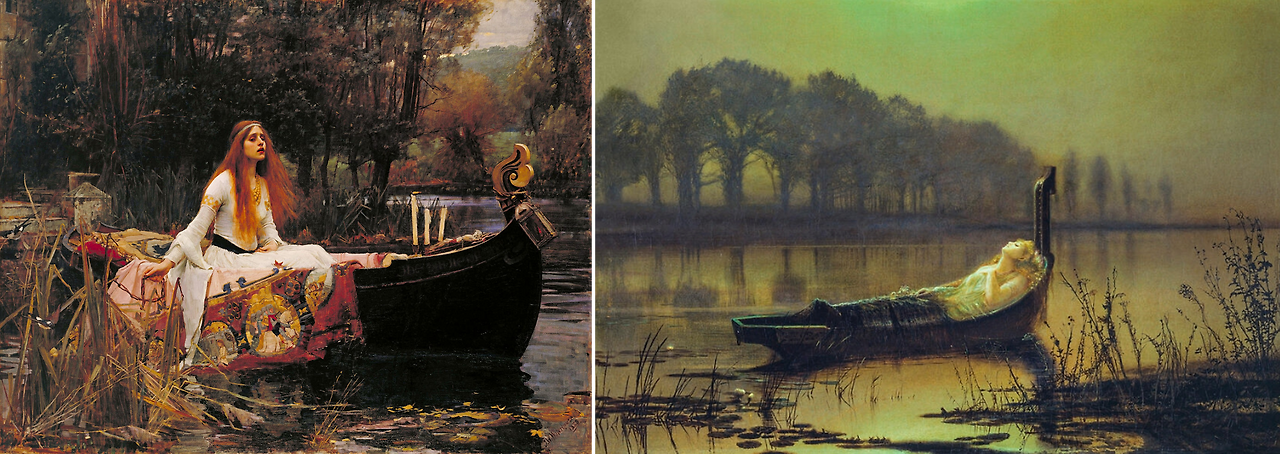 한편, 워터하우스의 그림(좌)에서 레이디 샬롯은 거울을 통해 바라본 연인들이 서로 사랑하는 모습을 수놓은 태피스트리를 깔고 앉아 강물 위를 둥둥 떠다닌다. 그러나 결국 영화 <레드 룸스> 속 모니터의 배경화면이던 존 앳킨스 그림쇼의 그림(우)처럼 배에 탄 채로 주검이 되어 (아마도 그녀를 알지못할) 카멜롯의 기사들 앞에 당도하게 된다.
