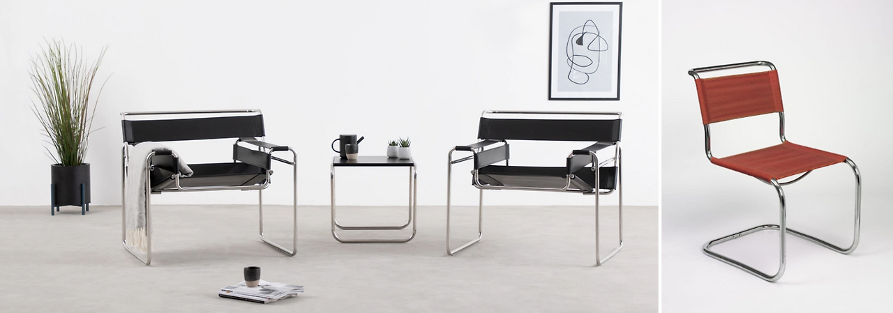 영화에서처럼 자전거에서 모티브를 얻어 최초...는 아니고 한끝차/두번째로 강철로 된 의자를 만들었습니다. (마르트 슈탐이 배관에서 모티브를 얻어서 몇개월 먼저 조립형으로 만들었던...) 강철 튜브를 한번에 매끈하게 구부려 만든 브로이어의 바실리 의자와 캔틸레버 의자는 모더니즘을 대표하는 작품으로 평가받고 있습니다.
