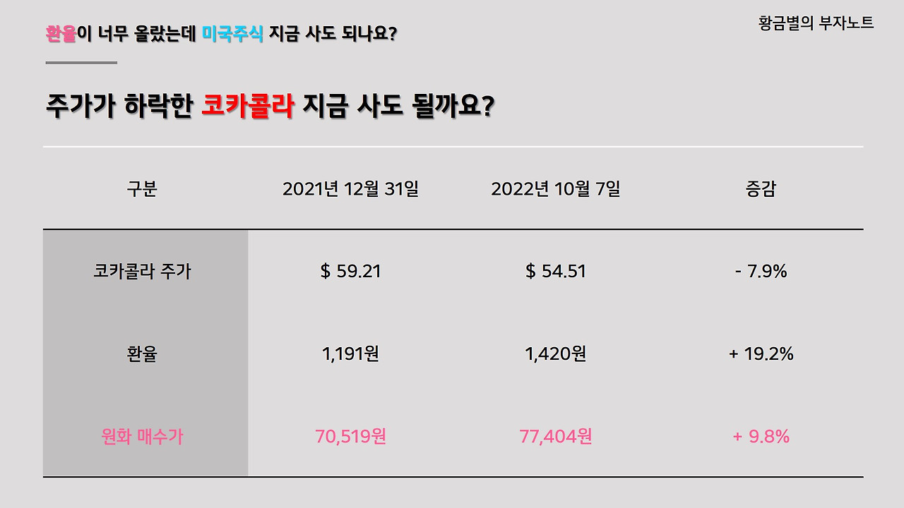 작년 12월 31일 환율은 1,191원이었고 원화 매수가로 환산하면 7만519원입니다. 하지만 환율이 무려 20% 가까이 상승했기 때문에 현재 5달러나 떨어진 코카콜라 주식 한주를 매수하는데 원화로는 77,404원이 필요합니다. 무려 7천 원이나 더 비싼겁니다. 즉 달러주가만 보고 지금 주가가 하락했다고 생각해서 덥썩 코카콜라 주식을 매수했다가는 작년보다도 더 비싼 가격에 사게 되는 겁니다. 물론 종목마다 하락폭이 다르기 때문에 코카콜라 한 종목만으로 비교기준을 삼기엔 어렵습니다. 하지만 투자자라면 반드시 투자할 종목에 대한 환율관리는 필요합니다. 특히나 미국주식은 원화기준으로 양도세가 계산되므로 주의해야 합니다.