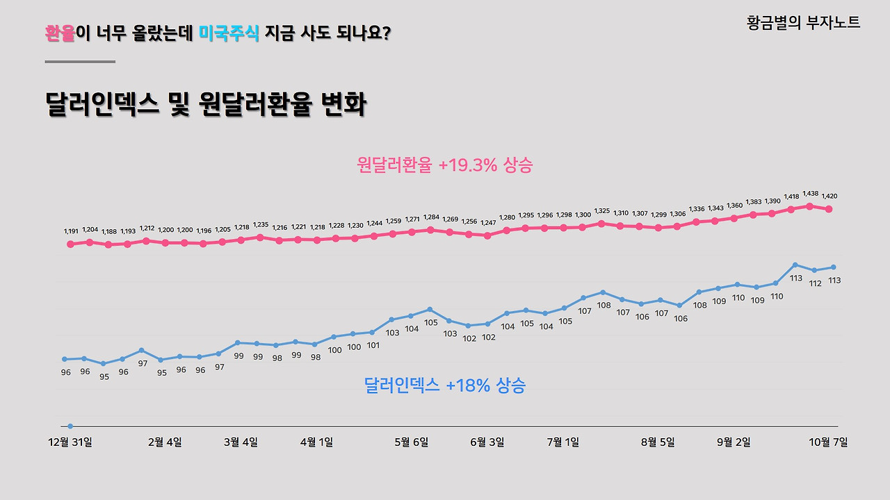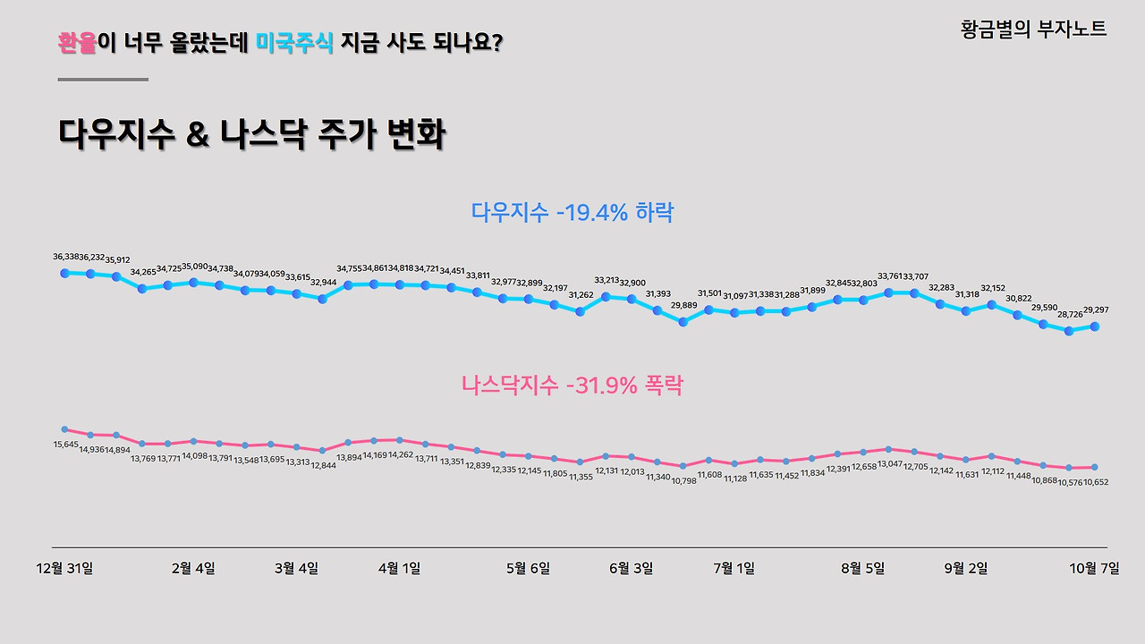 요즘 미국주식이 너무 폭락해서 주가가 낮아졌기 때문에 매력적인 구간으로 느껴지지만, 원달러환율때문에 주저하고 계신 분들이 많으신거 같아요. 제 영상에 달린 댓글에서도 많은 투자자분들이 같은 고민을 하시는거 같습니다. 저도 매월 받는 달러 배당금은 주가가 낮은 종목을 매수하기에는 좋은 타이밍이라고 생각하지만, 원화를 달러로 환전해서 매수하는 건 좀 주저하게 됩니다. 과연 원달러 환율이 얼마나 상승했고, 미국증시는 얼마나 폭락했을까요? 실제 숫자로 비교를 해봐야 감이 올거 같습니다. 같이 비교해볼까요?