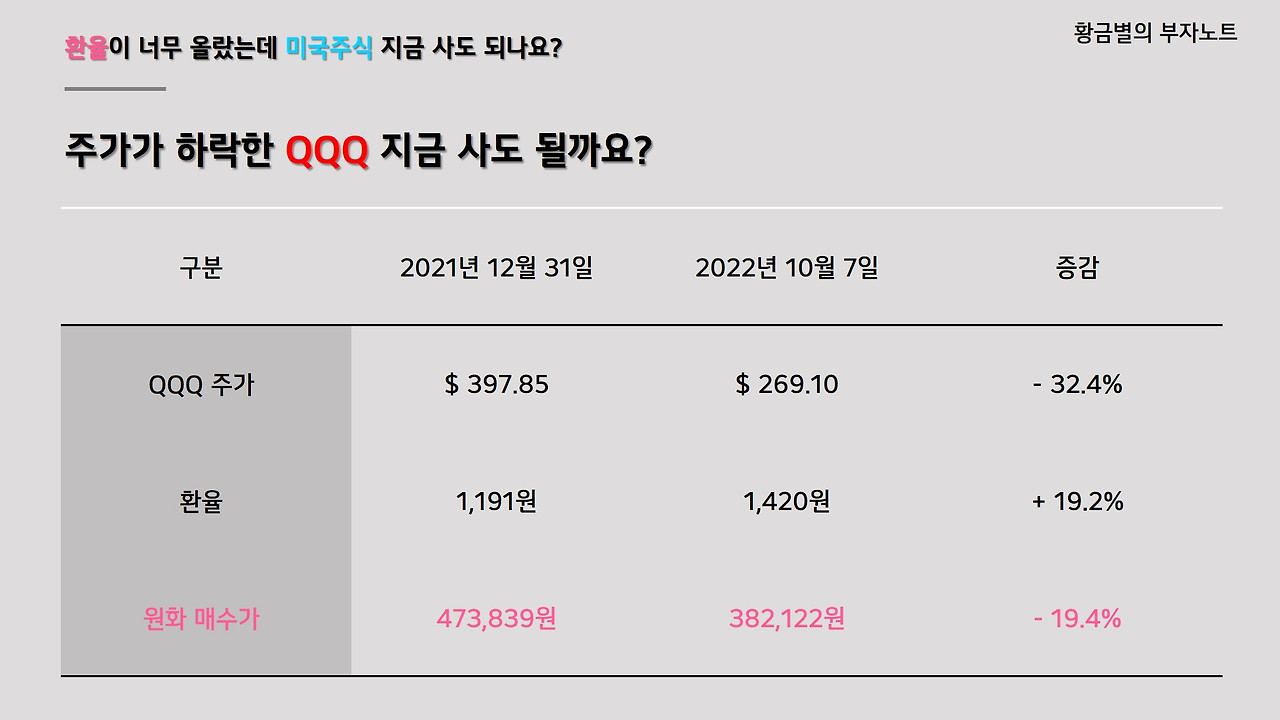 QQQ는 작년보다 주가가 무려 -32.4%나 폭락해서 작년 연말에 매수했다면 47만3천원이 필요했지만, 지금은 원달러환율 상승보다 주가 하락이 더 컸기 때문에 1주를 매수하는데 38만2천원이 소요되어 작년 연말보다 20% 가까이 할인된 가격에 매수를 할 수 있습니다. 즉 지금같은 폭락장, 원달러환율 강세장에서는 투자자들의 이성적인 냉철한 판단력이 필요한 시기인 것 같습니다.